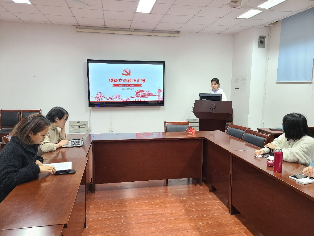 按照党组织接收党员的程序,首先,由预备党员于晴同志进行预备党员转正汇报,主要包括对党的认识,入党动机,个人经历,社会实践以及在校表现几个方面。随后由入党介绍人郑钰莹同志介绍于晴同志预备期间在政治思想、学习、工作和生活等方面的表现情况,支部书记赵娜介绍于晴同志在预备期间的教育和考察情况,与会党员也对预备党员是否符合党员条件发表了意见。