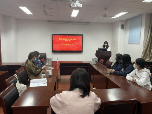 本科生党支部开展专题学习会,支部党员石雅琦与刘奥然分别结合近期时事热点进行“微党课”讲解,支部书记武昕宇主持会议。