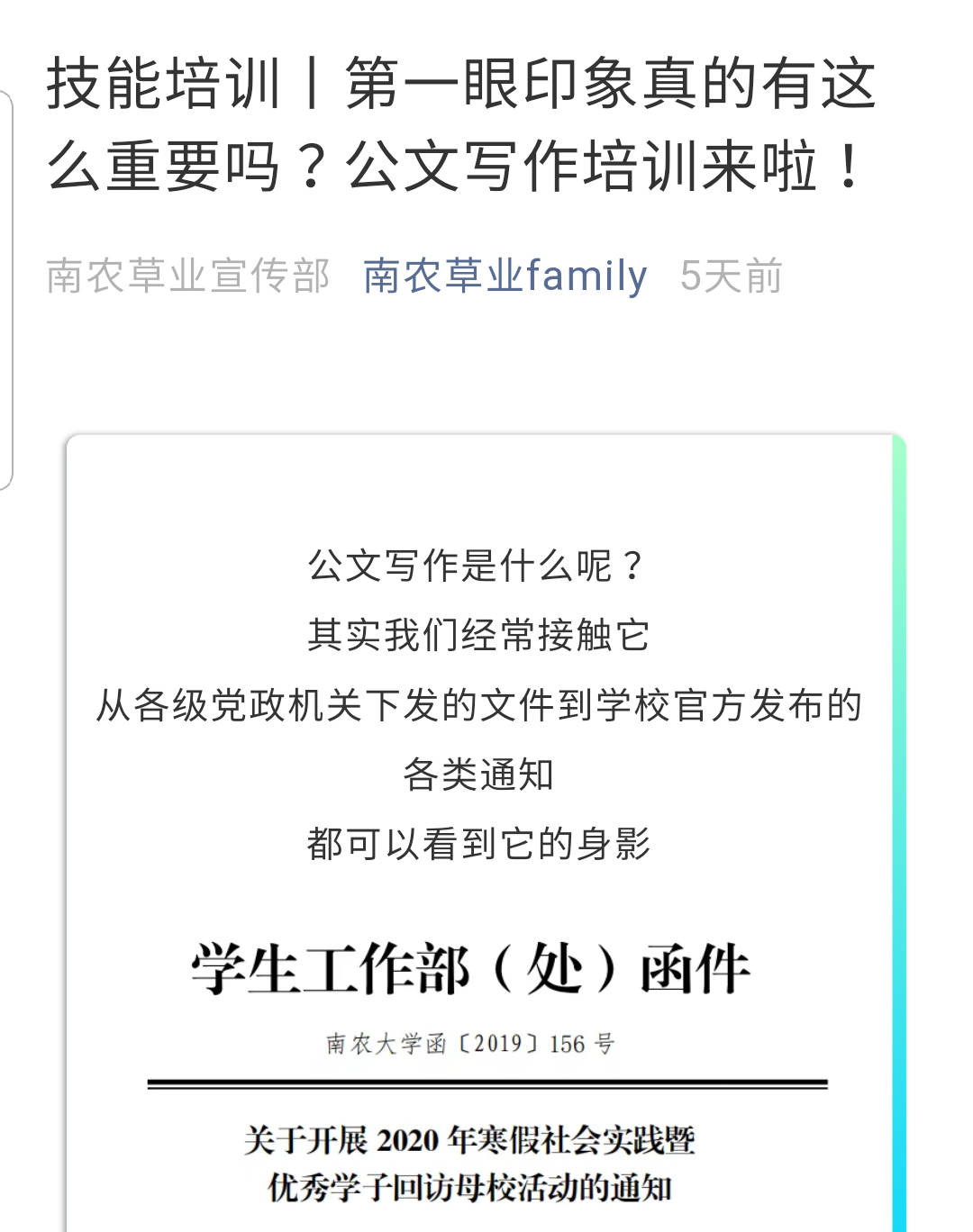 团委学生会干部的公文写作技能与工作能力,促进成人视频党团组织与班级的发展与建设,成人视频在草业Family公众号上以推送形式开展公文写作技能培训。