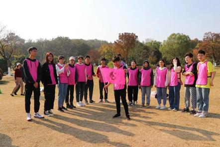 管老师先是用一个小游戏带动了大家的氛围,然后将所有人分为了红、粉、蓝三组,还分发了相应颜色的小马甲,每个小组还展示了各自的队旗、口号和队歌。随即开始进行正式活动。活动分为三个项目:一、雷区取瓶;二、同心鼓;三、决胜150。