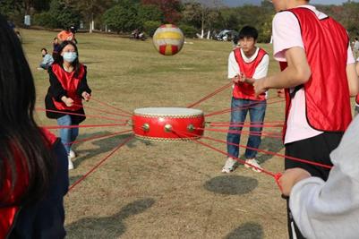 游戏开始时,每组所有人都上场,每个人拉着鼓的一根绳子,每个队员牵拉一根绳子,保证鼓面水平。同时另选出一名队友将一个排球从鼓面中心上方竖直抛下,队员们齐心协力将球颠起,颠球次数最多者胜出,颠的次数最少的组享受抽签惩罚。该项目非常考验团队协作能力,需要每个人的通力配合,最后大家的成绩都很不错,最高的组颠了118次。同心鼓项目还引来附近小朋友的热烈加油,现场气氛燃到极点。