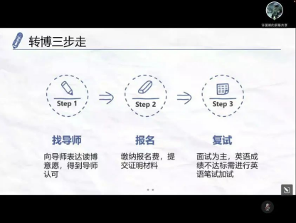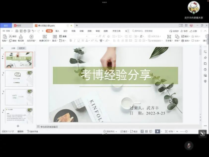 她从考博前期准备和考博注意事项等两部分分享了自己考博的历程和心得。她分享了自己在备考过程中获取信息的来源渠道,强调了笔试和面试时要注意的事项。她说勉励大家要耐得住科研的苦,有苦才有甜。