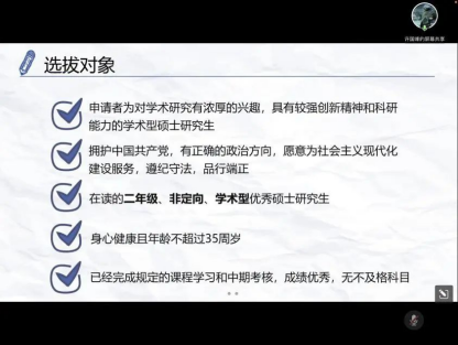 他分享了自己平日丰富多彩的科研生活,介绍了申请硕博连读需要具备的条件和要求,突出强调了对英语能力的要求和面试时的注意事项。他勉励大家做好人生规划,把握时机。