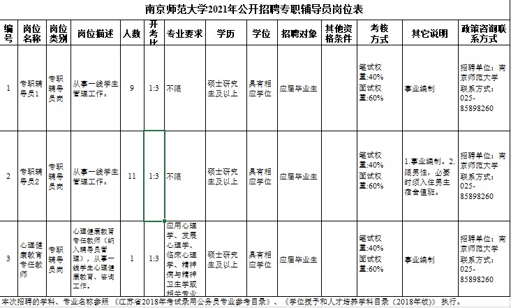 南京师范大学是省教育厅主管的全额拨款事业单位,位于南京市栖霞区文苑路1号。为更好地选拔优秀适岗人才,充实人才队伍,优化师资结构,南京师范大学现面向社会公开招聘优秀专职辅导员。根据《江苏省事业单位公开招聘人员办法》(苏办发〔202009号)等规定,现将有关事项公告如下: