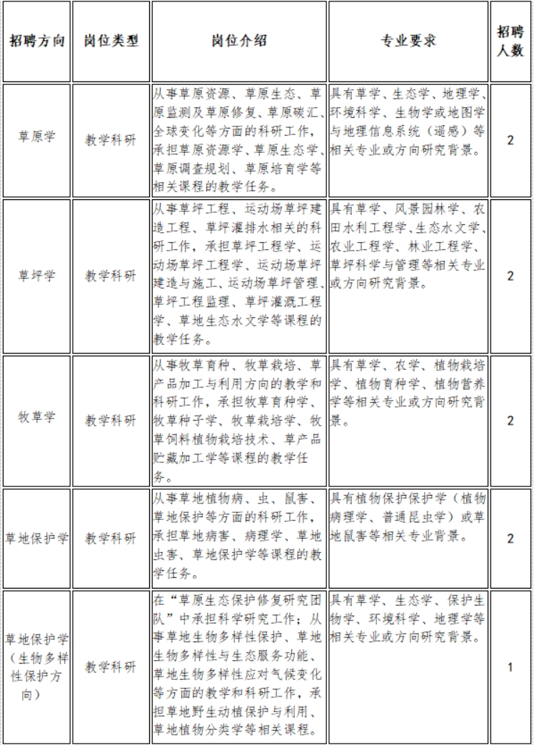 2. 招聘二级学科或方向:草原学、草坪学、牧草学、草地保护学以及草地保护学(生物多样性保护方向)。