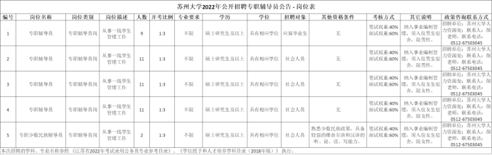 苏州大学是省教育厅主管的全额拨款事业单位,位于苏州市十梓街1号。为更好地选拔优秀适岗人才,充实人才队伍,优化师资结构,苏州大学现面向社会公开招聘优秀人才。现决定面向社会公开招聘专职辅导员44名。根据《江苏省事业单位公开招聘人员办法》等规定,现将有关事项公告如下: