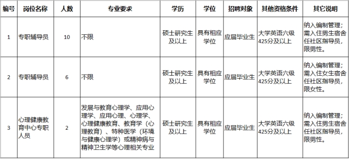 2.有1年(12个月)及以上本科高校专职辅导员岗位或学生管理岗位(学生工作处(部)、研究生工作部、校团委)连续全职工作经历;